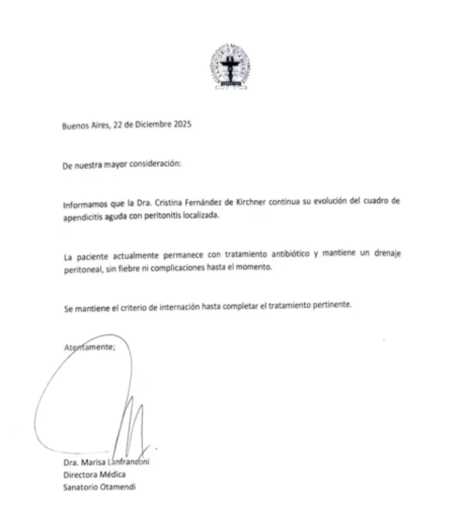 El comunicado lleva la firma de la directora médica del Sanatorio Otamendi, la doctora Marisa Lanfrandoni, y ratifica que la evolución de la ex presidenta se desarrolla dentro de los parámetros esperados, sin que hasta el momento se hayan registrado complicaciones adicionales.