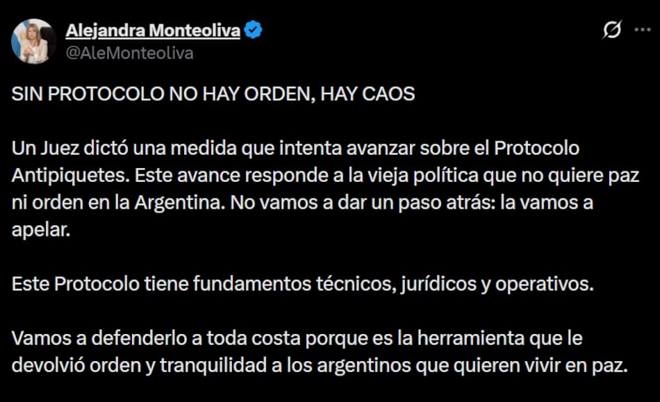 “Un Juez dictó una medida que intenta avanzar sobre el Protocolo Antipiquetes. Este avance responde a la vieja política que no quiere paz ni orden en la Argentina. No vamos a dar un paso atrás: la vamos a apelar”, afirmó Monteoliva.