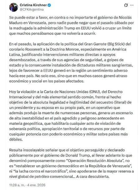 La expresidenta Cristina Kirchner rompió el silencio tras la captura de Nicolás Maduro, calificando el accionar de Estados Unidos como un “secuestro literal” que viola el Derecho Internacional.