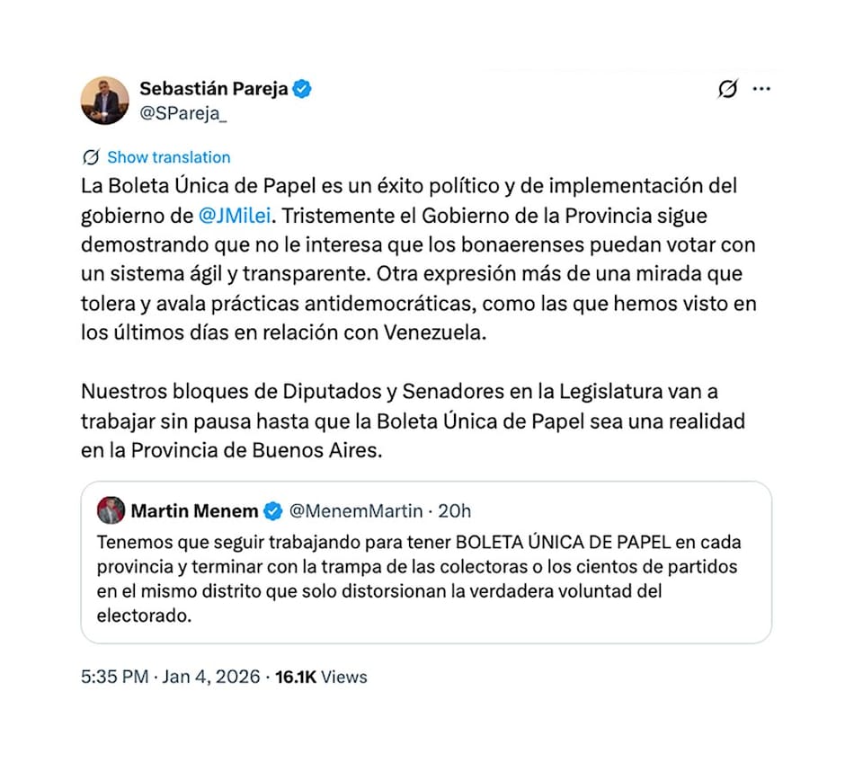 La Libertad Avanza busca implementar la Boleta Única de Papel en la Ciudad de Buenos Aires y en la provincia. Martín Menem y Sebastián Pareja pidieron en Twitter por su aplicación en cada provincia en la que aún no se ha implementado. El bloque oficialista en la Legislatura porteña y el Senado bonaerense trabajarán para que se apruebe durante el transcurso de 2026 pensando en las elecciones presidenciales de 2027.