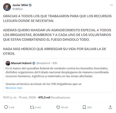 El presidente Javier Milei se expresó en la red social X en agradecimiento a los bomberos que están trabajando combatiendo los incendios en la Patagonia. Hizo hincapié en brigadistas, bomberos y voluntarios que luchan contra el fuego.