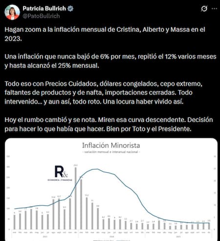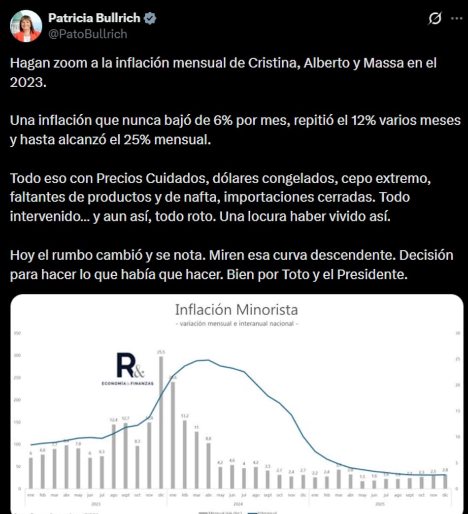 En una publicación en la red social X, Bullrich dijo que “todo eso con Precios Cuidados, dólares congelados, cepo extremo, faltantes de productos y de nafta, importaciones cerradas. Todo intervenido… y aun así, todo roto. Una locura haber vivido así”.