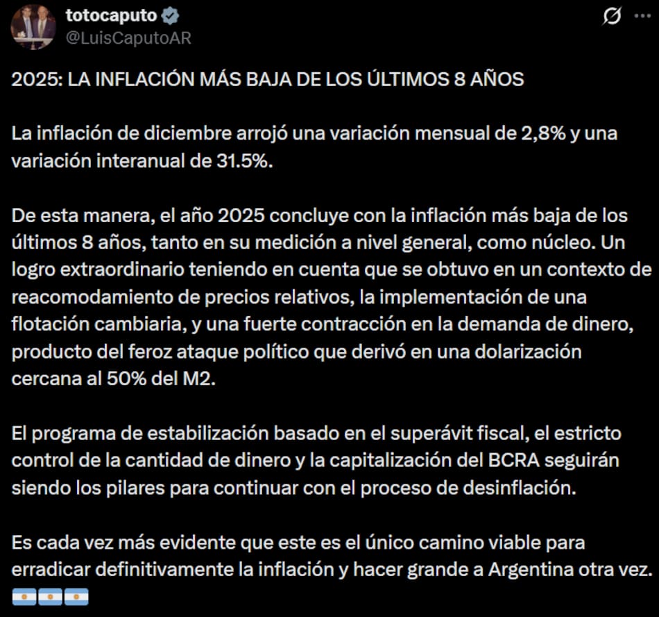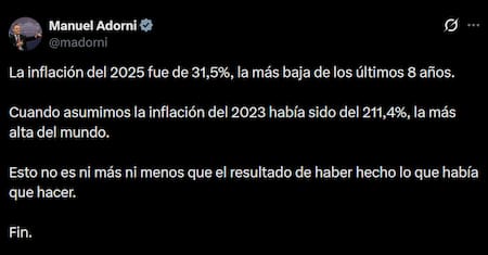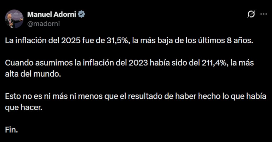 Por su parte, el jefe de Gabinete, Manuel Adorni, también resaltó que la inflación de 2025 fue de 31,5%, la más baja de los últimos 8 años".