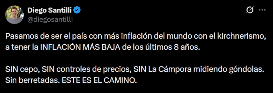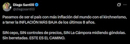 “Cuando asumimos la inflación del 2023 había sido del 211,4%, la más alta del mundo. Esto no es ni más ni menos que el resultado de haber hecho lo que había que hacer. Fin”, publicó el funcionario en la red social X.