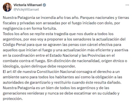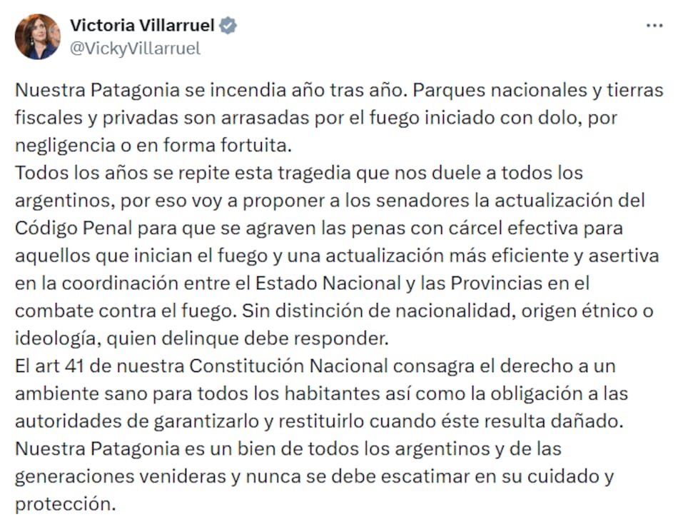 “Nuestra Patagonia se incendia año tras año. Parques nacionales y tierras fiscales y privadas son arrasadas por el fuego iniciado con dolo, por negligencia o en forma fortuita. Todos los años se repite esta tragedia que nos duele a todos los argentinos", sentenció en su cuenta de X. Y agregó: “Voy a proponer a los Senadores la actualización del Código Penal para que se agraven las penas con cárcel efectiva para aquellos que inician el fuego y una actualización más eficiente y asertiva en la coordinación entre el Estado Nacional y las Provincias en el combate contra el fuego”.