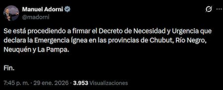 “Se está procediendo a firmar el Decreto de Necesidad y Urgencia que declara la Emergencia Ígnea en las provincias de Chubut, Río Negro, Neuquén y La Pampa. Fin”, escribió Adorni en la red social X.