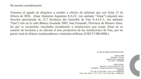 “Tenemos el agrado de dirigirnos a ustedes a efectos de informar que con fecha 13 de febrero de 2026, Aluar Aluminio Argentino S.A.I.C. adquirió una fracción aproximada de 12,7 hectáreas del inmueble de Fate S.A.I.C.I., (en adelante “Fate”) sito en la calle Blanco Encalada 3003, San Fernando, Provincia de Buenos Aires", comunicó la empresa este miércoles.