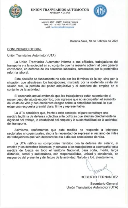 “La UTA ratifica su compromiso histórico con la defensa del salario, el empleo y los derechos laborales, y convoca a los trabajadores a acompañar esta medida de fuerza en todo el territorio nacional, para corta, media, larga distancia, combi y subterráneo, con responsabilidad, unidad y conciencia, en resguardo del presente y del futuro de la actividad”, expresó el gremio en un comunicado.