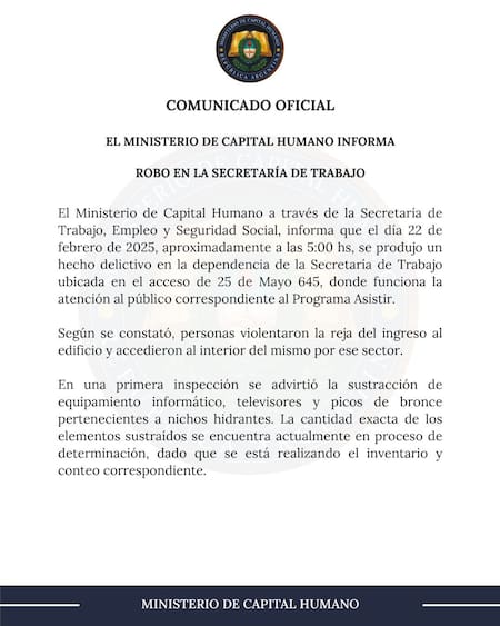 “El Ministerio de Capital Humano a través de la Secretaría de Trabajo, Empleo y Seguridad Social, informa que el día 22 de febrero de 2025, aproximadamente a las 5:00 hs, se produjo un hecho delictivo en la dependencia de la Secretaría de Trabajo ubicada en el acceso de 25 de Mayo 645, donde funciona la atención al público correspondiente al Programa Asistir”, señala el texto oficial.