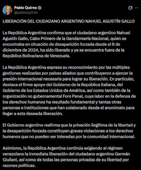 “La República Argentina confirma que el ciudadano argentino Nahuel Agustín Gallo, Cabo Primero de la Gendarmería Nacional, quien se encontraba en situación de desaparición forzada desde el 8 de diciembre de 2024, ha sido liberado y ya se encuentra fuera de la República Bolivariana de Venezuela”, expresó el Canciller en redes sociales.
