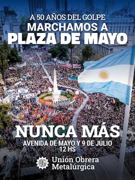 Por su parte, la conducción de la CGT convocó a sumarse a la marcha a las 14 en Diagonal Sur y Bolívar. “Porque la memoria no se negocia. Porque la lucha sigue. Porque florecerán pañuelos”, expresó la central en un comunicado. Por su parte, la UOM difundió su propia convocatoria a la movilización junto a las Madres y Abuelas de Plaza de Mayo, entre otros organismos.