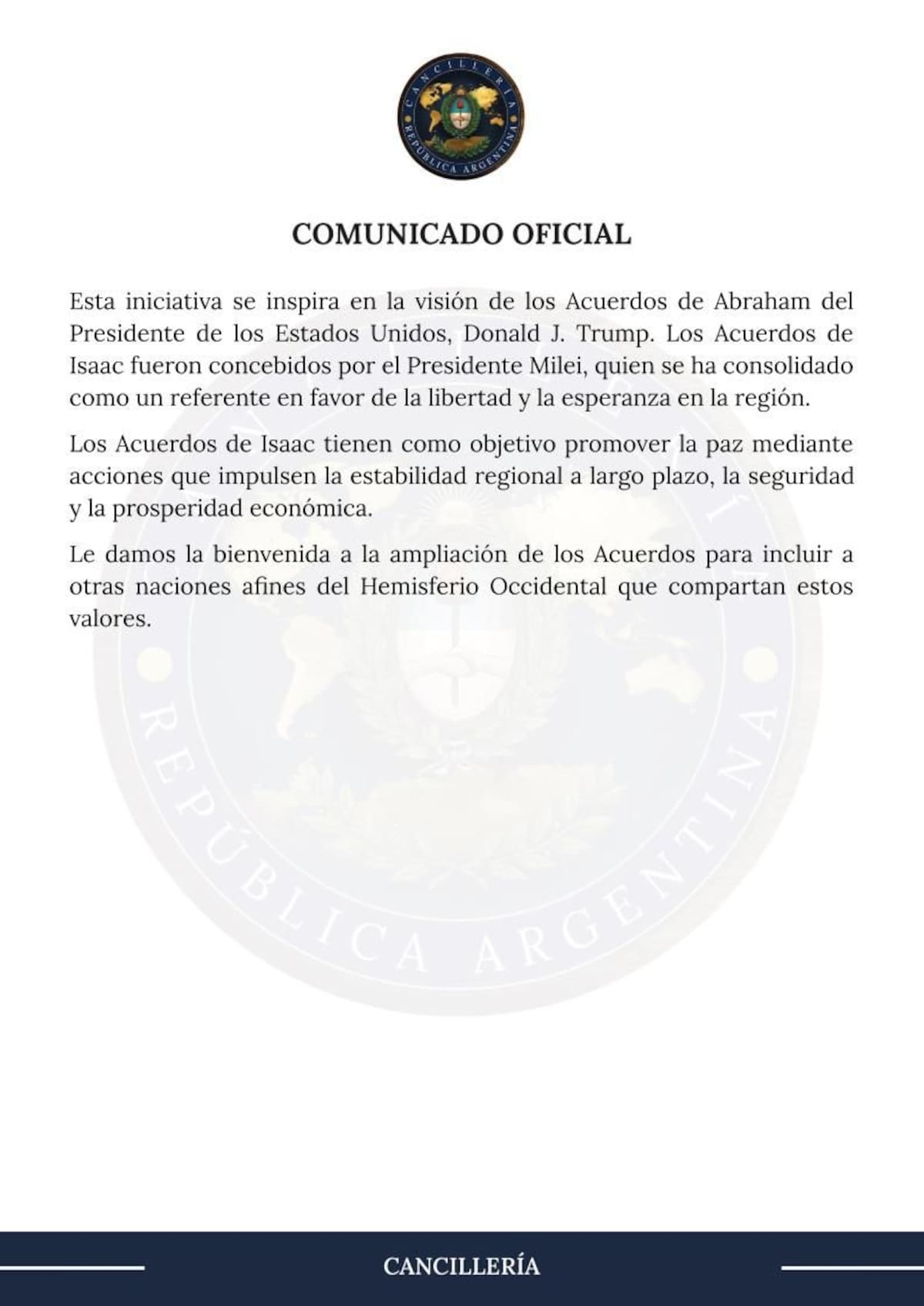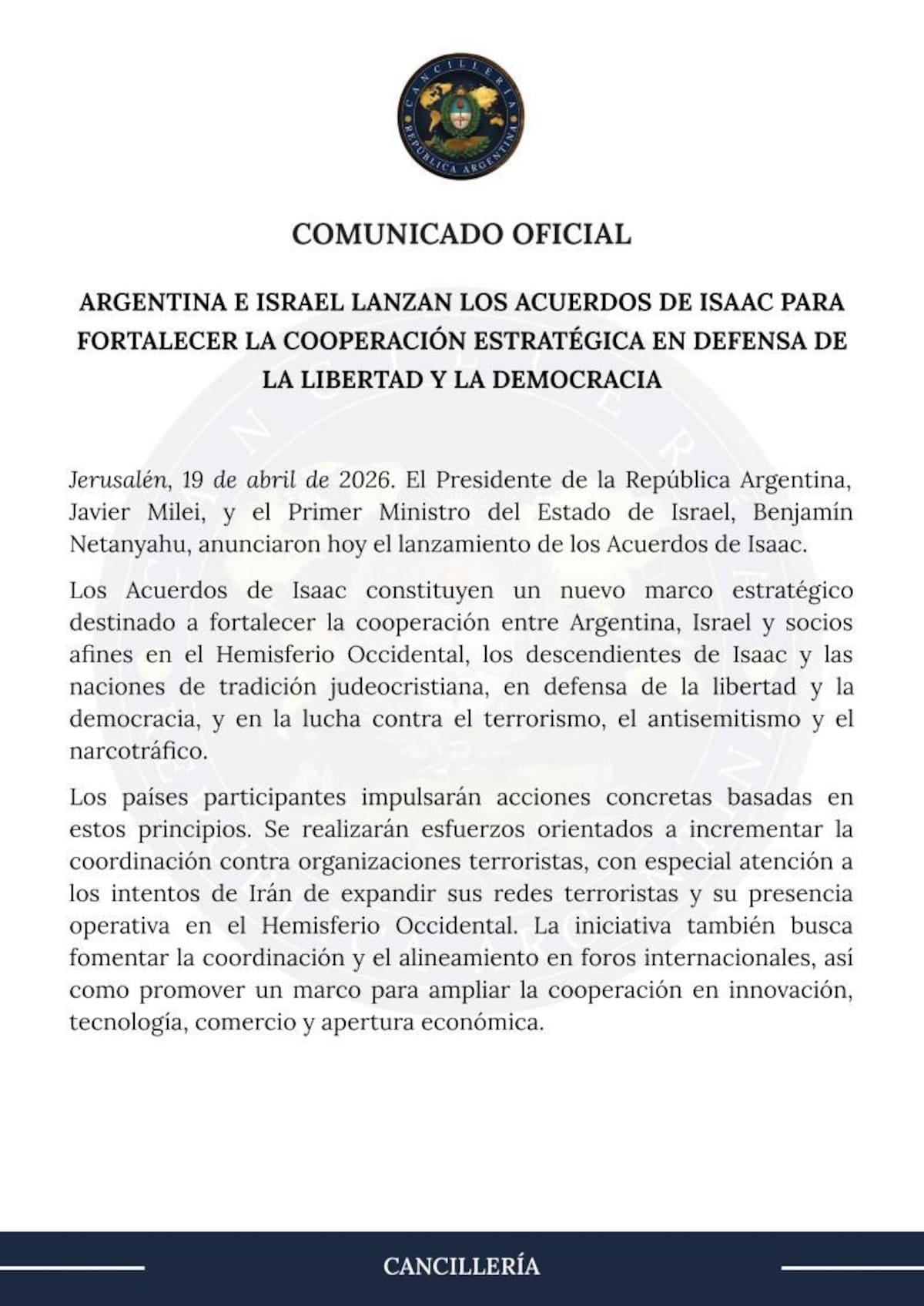 Asimismo, el presidente argentino formalizó su adhesión a los llamados “Acuerdos de Isaac”, una iniciativa destinada a fortalecer vínculos diplomáticos, comerciales y culturales entre Israel y países de América Latina.