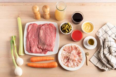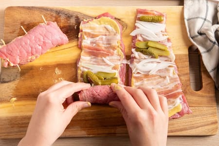 La clave para hacer fácilmente los rouladen está en elegir unos filetes de ternera finos y tiernos, que se puedan enrollar bien sin romperse, y no escatimar en su relleno: lonchas de bacon y pepinillos.