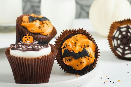 Los cupcackes de calabaza se preparan con calabaza, aceite vegetal y un toque de especias. Cubrí con una crema vegetal teñida de naranja o agregale toppers en forma de fantasma o murciélago.
