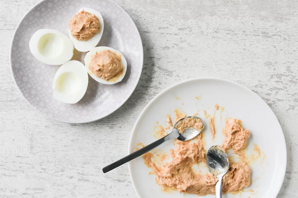 - Preparar el relleno: en un bol, pisá las yemas con un tenedor. Agregá la mayonesa, la mostaza y el atún escurrido (o la papa pisada si querés una versión más suave). Condimentá con sal y pimienta.