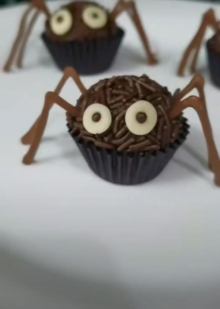 Pegá dos confites en la parte delantera con un poco de chocolate derretido para hacer los ojos. Llevá las arañas a la heladera por 30 minutos para que tomen consistencia… ¡y listo!