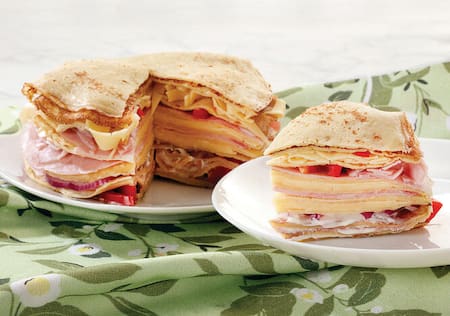 La torre de panqueques salada es un clásico de las festividades argentinas. Tarda poco en prepararse, se sirve fría y tiene una estética llamativa.