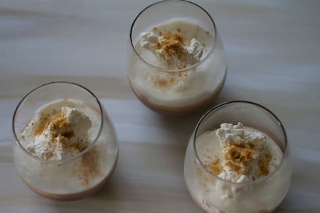 - Sacar los vasitos de la heladera y colocarlos inclinados (apoyados en un molde de muffins o con cuñas de papel). Repartir la crema de turrón en los vasitos.