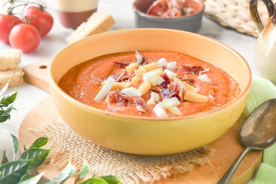 2. Colocá en la batidora primero un poco de tomate y luego otro poco de pan. Batí y añadí, poco a poco, más tomate y pan junto al aceite, el ajo (previamente picado), la sal y el vinagre (opcional).