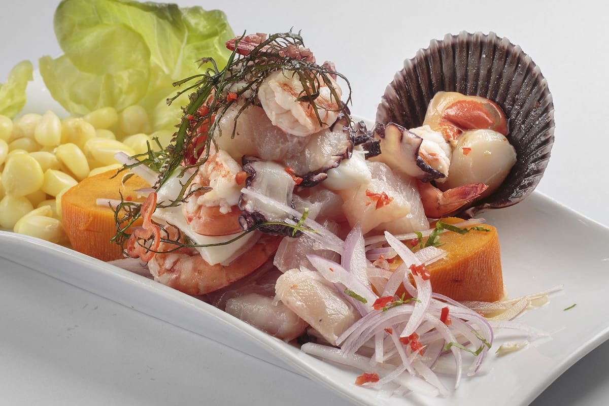 El ceviche es el plato nacional del Perú y consiste en rodajas de pescado o marisco crudo, condimentadas con sal, cebolla y ají, y marinadas en jugo de limón. Debido a la acidez del jugo de limón, la textura del pescado cambia, al igual que su color, de rosado a blanco.