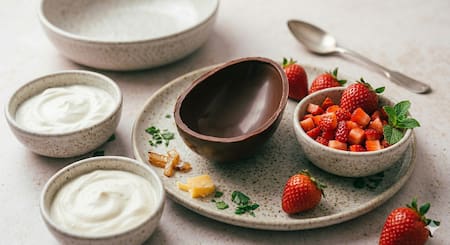 A la hora de pensar en Pascua, se debe pensar también en la mesa dulce y qué mejor si hacemos postres con opciones donde el yogur griego esté incluido o deliciosos trozos frutas, según tu gusto y preferencia. El chocolate tiene múltiples combinaciones. En esta oportunidad, se recomienda utilizar frutillas, aunque también puede ser durazno, algunas almendras tostadas o los toppings que tengas en casa.