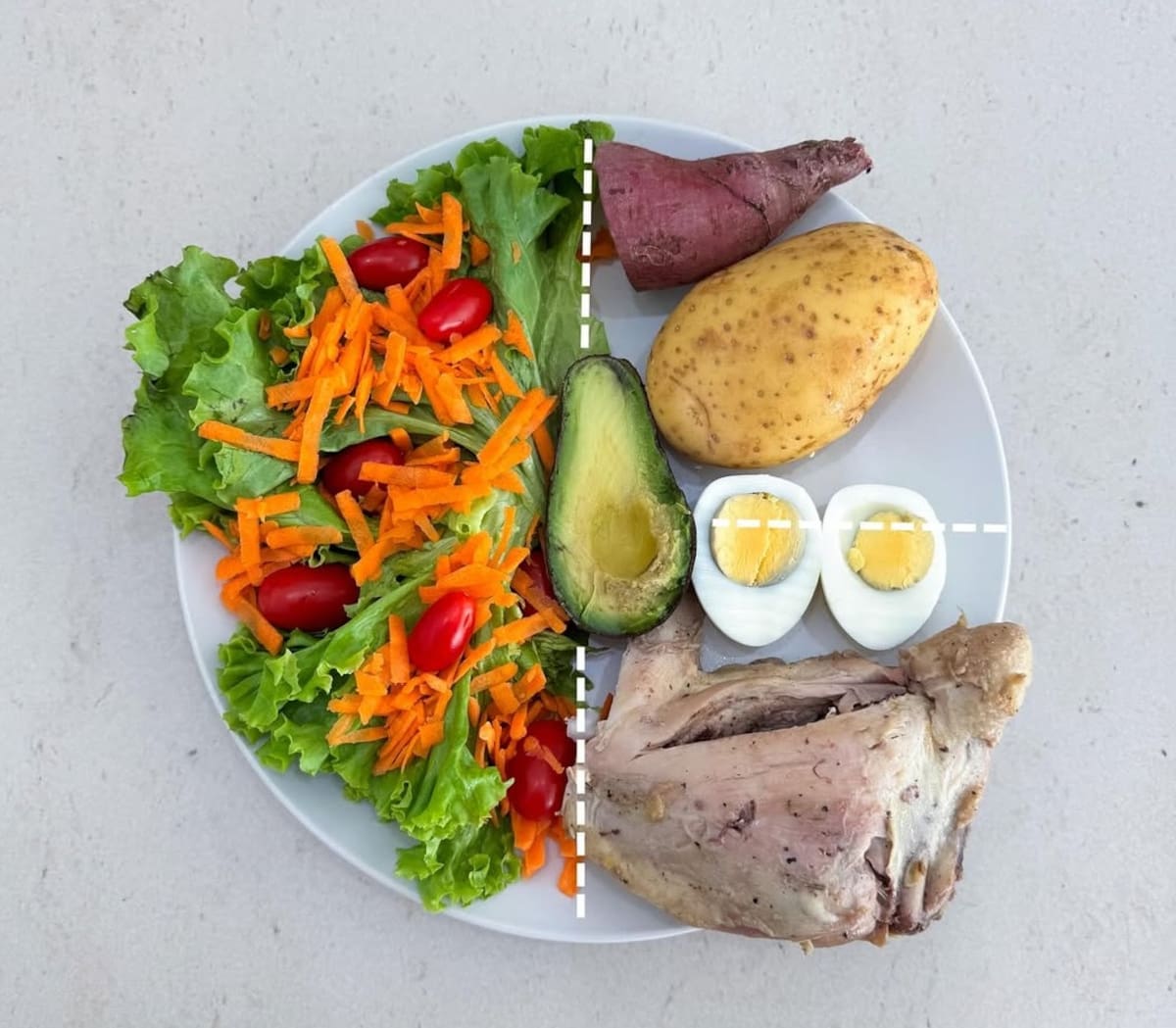 - ¼ plato de carbohidratos: papa, batata, choclo, mandioca, cereales (arroz integral, yamaní, pastas, masas) y legumbres.
