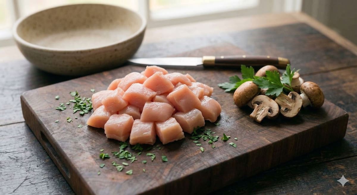 - Tomamos las pechugas y las cortamos en cubos. Reservamos.