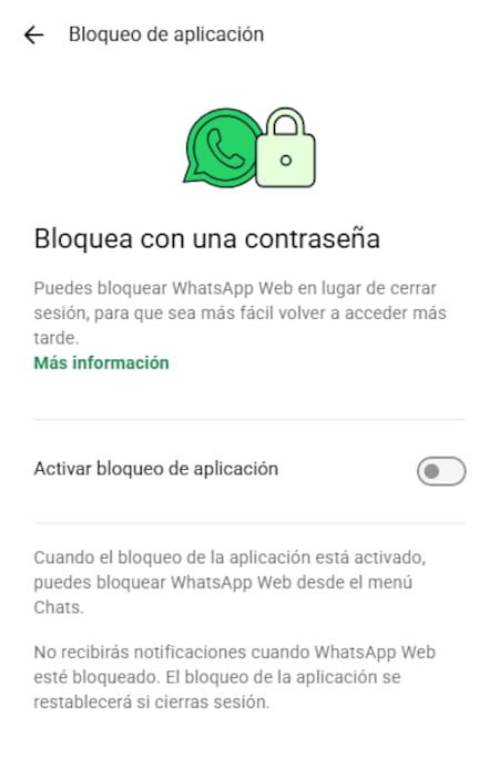 El bloqueo de aplicación es una capa extra de seguridad que restringe el acceso a la versión web de WhatsApp mediante una contraseña creada por el usuario. Una vez activada, la plataforma queda bloqueada y solo puede volver a utilizarse ingresando esa clave.