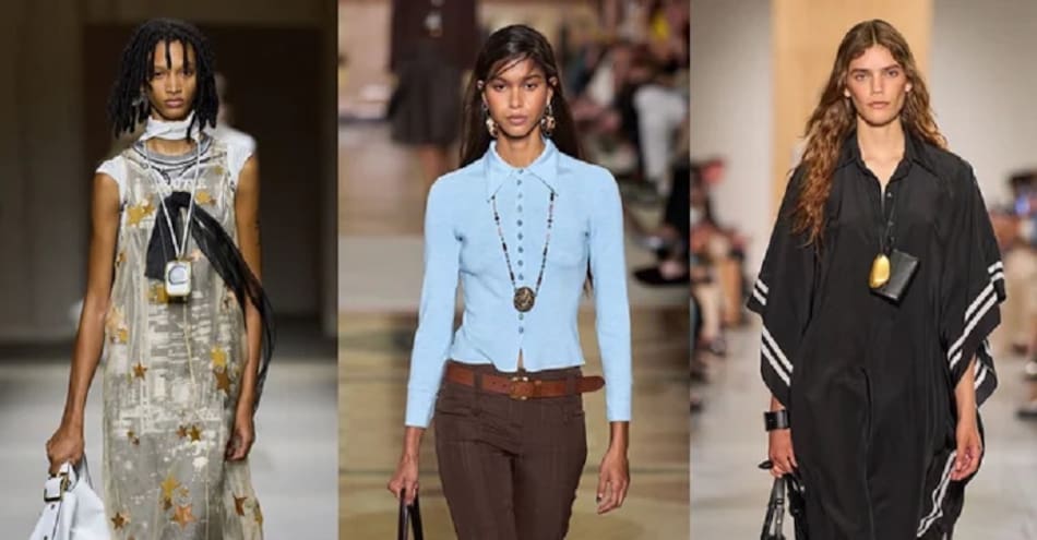 Tambien están los collares colgantes o estilo “pendiente grande”, aqui la joyería se inclina nuevamente hacia piezas que cuelgan, que se notan, que tienen presencia.