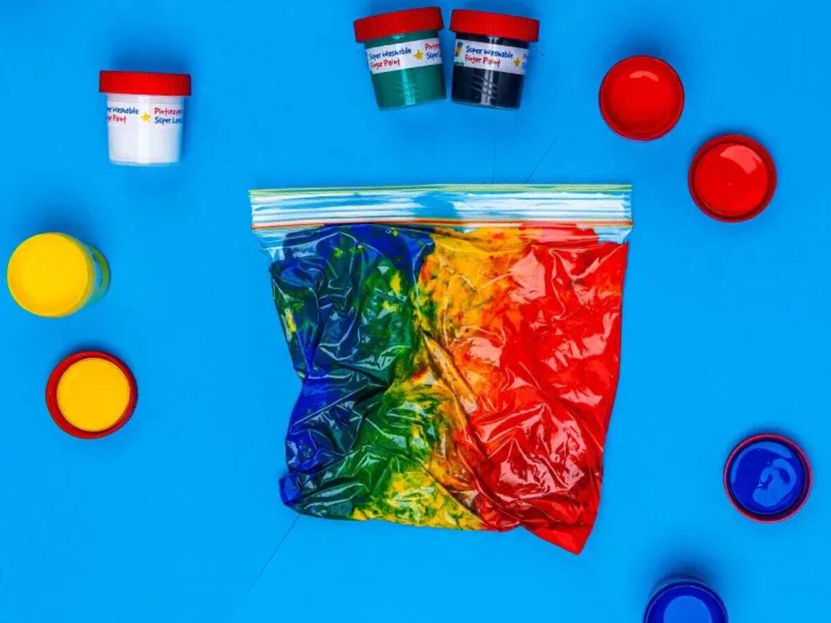 La pintura en bolsas sensoriales es una actividad ideal para niños pequeños. Es segura, no requiere tijeras ni piezas pequeñas, y los niños no entran en contacto directo con la pintura. Para prepararla, un adulto coloca un par de cucharadas de témperas lavables dentro de una bolsa tipo zip grande, preferentemente en colores navideños como rojo, verde, blanco o amarillo. La pintura se ubica en el centro de la bolsa y se cierra reforzando los bordes con cinta adhesiva. La bolsa se puede colocar sobre una mesa protegida con papel o mantel.
