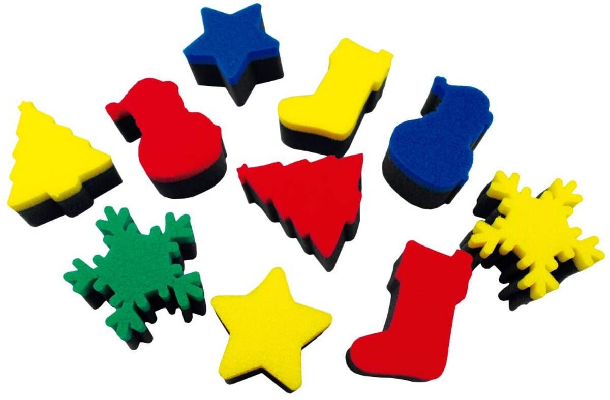 En primer lugar, el adulto pega una cartulina en la pared o en el piso para evitar enchastres. Luego, corta unas esponjas en formas de copo de nieve, árbol, estrella, círculo y cuadrado, simulando ser un regalo. Primero dibuja la forma y después lo corta con tijera o cuter.