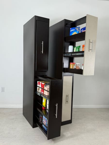 Entre sus características más destacadas se encuentran el almacenamiento vertical, los estantes ocultos, las barras plegables que se convierten en comedor diario y los compartimentos diseñados para organizar utensilios y alimentos. Todo en un único mueble pensado para aprovechar al máximo cada centímetro disponible.