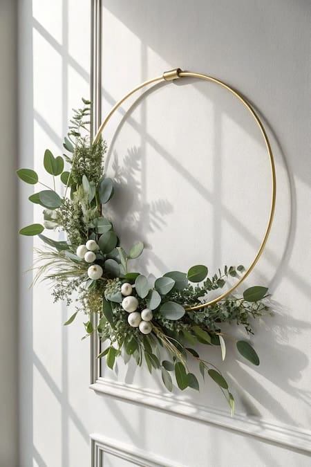 Para sumar esta tendencia a la casa, podrías elegir un aro fino en tonos dorados, negro o incluso color cobre y añadirle pequeños detalles como espigas, flores, eucaliptos y pegarlos con plasticola para hacer tu propio adorno navideño.
