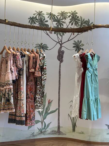 El local ofrece 200 prendas de la colección verano 2026 y entre ellas se encuentran vestidos, remeras, blusas y conjuntos con los estampados de la marca.