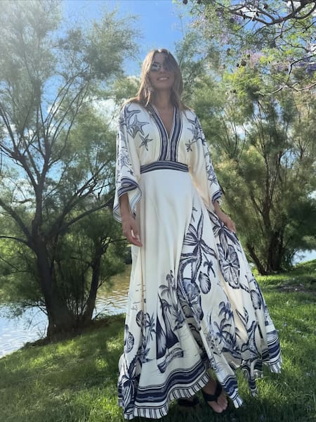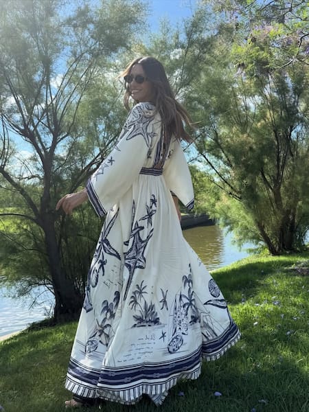 La pieza, firmada por FARM Rio, retoma la esencia clásica de la túnica, pero la actualiza con un corte más moderno y estilizado. Presenta mangas amplias, un fit relajado y una caída fluida que acompaña cada paso, elementos que potencian su carácter versátil.