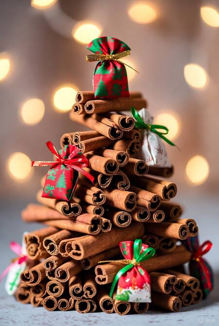 - Colocalas en las ramas del árbol: distribuí los adornos de canela de forma equilibrada, como harías con las bolas o luces. Evitá agrupar demasiadas en un solo sector para que el aroma sea uniforme pero no excesivo.