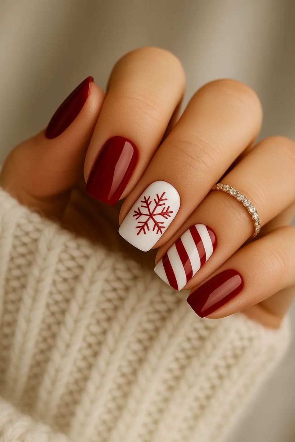 El rojo es el color navideño por excelencia. En uñas cortas, un esmalte rojo intenso y bien pulido aporta elegancia y sofisticación sin esfuerzo. Es ideal para quienes buscan un look tradicional que nunca pasa de moda.