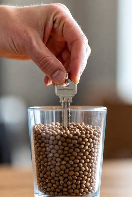 - Colocá una llave metálica dentro del vaso, apoyándola sobre las lentejas.