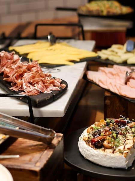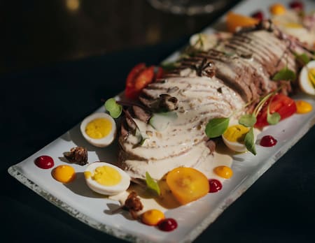 La celebración inicia con una amplia mesa de fiambres, quesos artesanales y especialidades frías que sintetizan su identidad mediterránea. Porchetta, bresaola, jamón crudo serrano, mortadela con nueces y quesos Tomme, gorgonzola, camembert, ahumado y burrata conviven con opciones clásicas como vitello tonnato, lengua a la criolla y matambre casero, además de propuestas de mar. La frescura llega de la mano de ensaladas que completan la apertura del menú: una Caesar con camarones, la tradicional panzanella y un mix de hojas verdes con tomates cherry, huevo mollet y vegetales de estación.