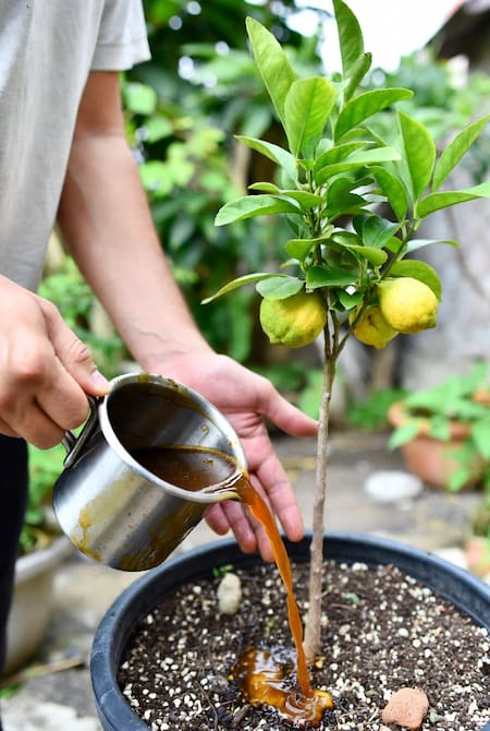 - Regar con moderación: usá este té para regar alrededor de la base del limonero una vez por semana. Es clave que la tierra drene bien y que no haya exceso de agua, ya que el riego irregular empeora el amarillamiento.
