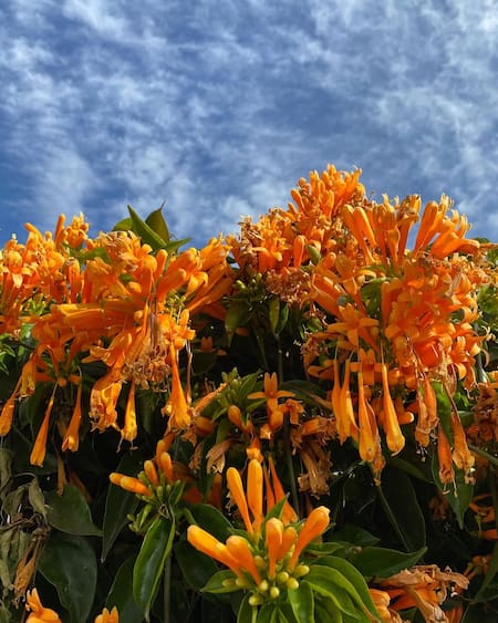 Para quienes buscan follaje persistente, esta especie arbustiva despliega racimos de flores naranjas y rojizas durante el otoño. Además de embellecer, atrae colibríes y sirve de marco para que otras plantas resalten su cambio de color.