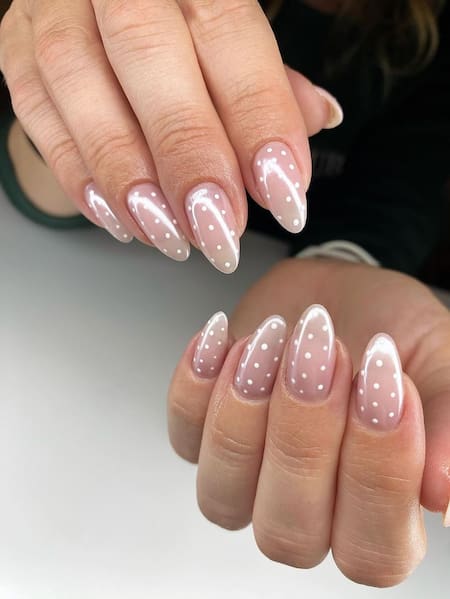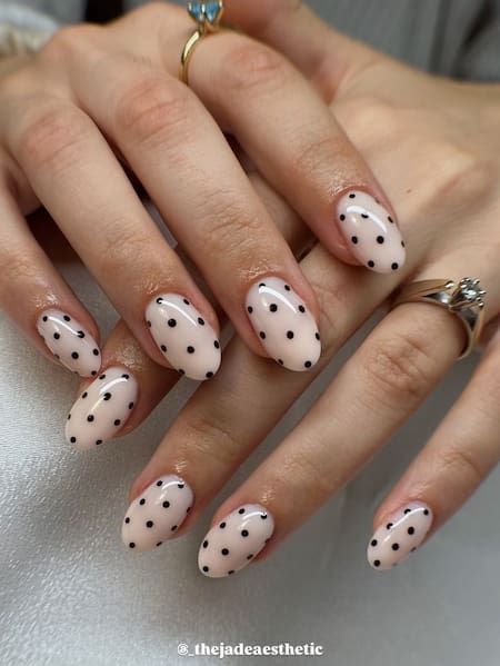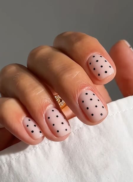 Es uno de los diseños más elegantes y minimalistas. Consiste en aplicar una base en tono nude o beige claro y sumar pequeños puntitos negros cerca de la cutícula o en el centro de la uña.
