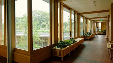 Uno de los mayores aciertos del proyecto es cómo el diseño arquitectónico influye directamente en la calidad de vida. Los pasillos son amplios, luminosos y están pensados como espacios de permanencia, no solo de circulación: hay bancos, plantas y detalles que invitan a detenerse y conversar.