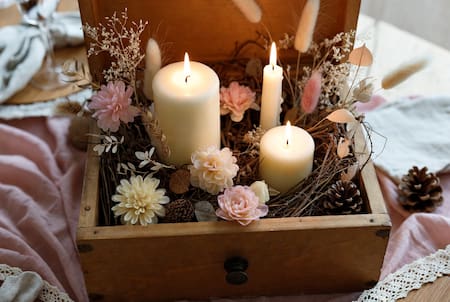 El centro debe ser simple pero con personalidad. Elegir un contenedor reciclado (como un cajoncito de madera). Completar con: