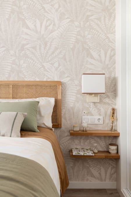 Las paredes cobran protagonismo con pinturas especiales, paneles de madera o papeles con relieve. Esta opción reemplaza al respaldo tradicional y crea un punto focal elegante sin ocupar espacio adicional.