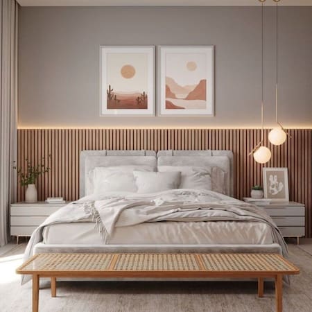 Los cuadros grandes o murales artísticos reemplazan al respaldo y aportan personalidad. Esta tendencia es ideal para quienes buscan un dormitorio con carácter y estilo propio.