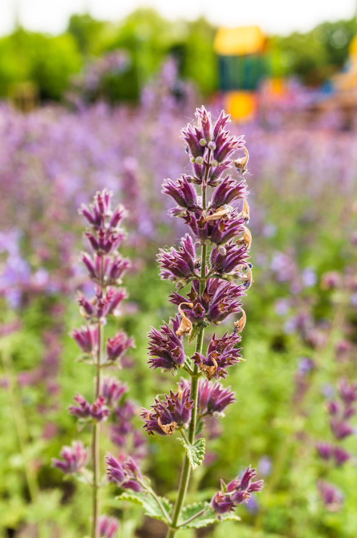 La Salvia leucantha suele tener flores blancas en dúo con el color amatista, que es un púrpura azulado semiclaro, y tiene un follaje afelpado resistente que mantiene el color incluso cuando se seca la planta.