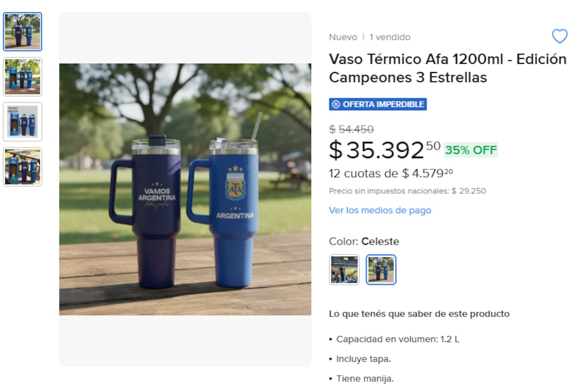 - Opción Premium: los vasos tipo “Quencher” o “Stanley” con el logo de la AFA se consiguen en stands de shoppings por un aproximado de $35.000. En Mercado Libre también hay numerosas opciones disponibles con disponibilidad de cuotas sin interés.