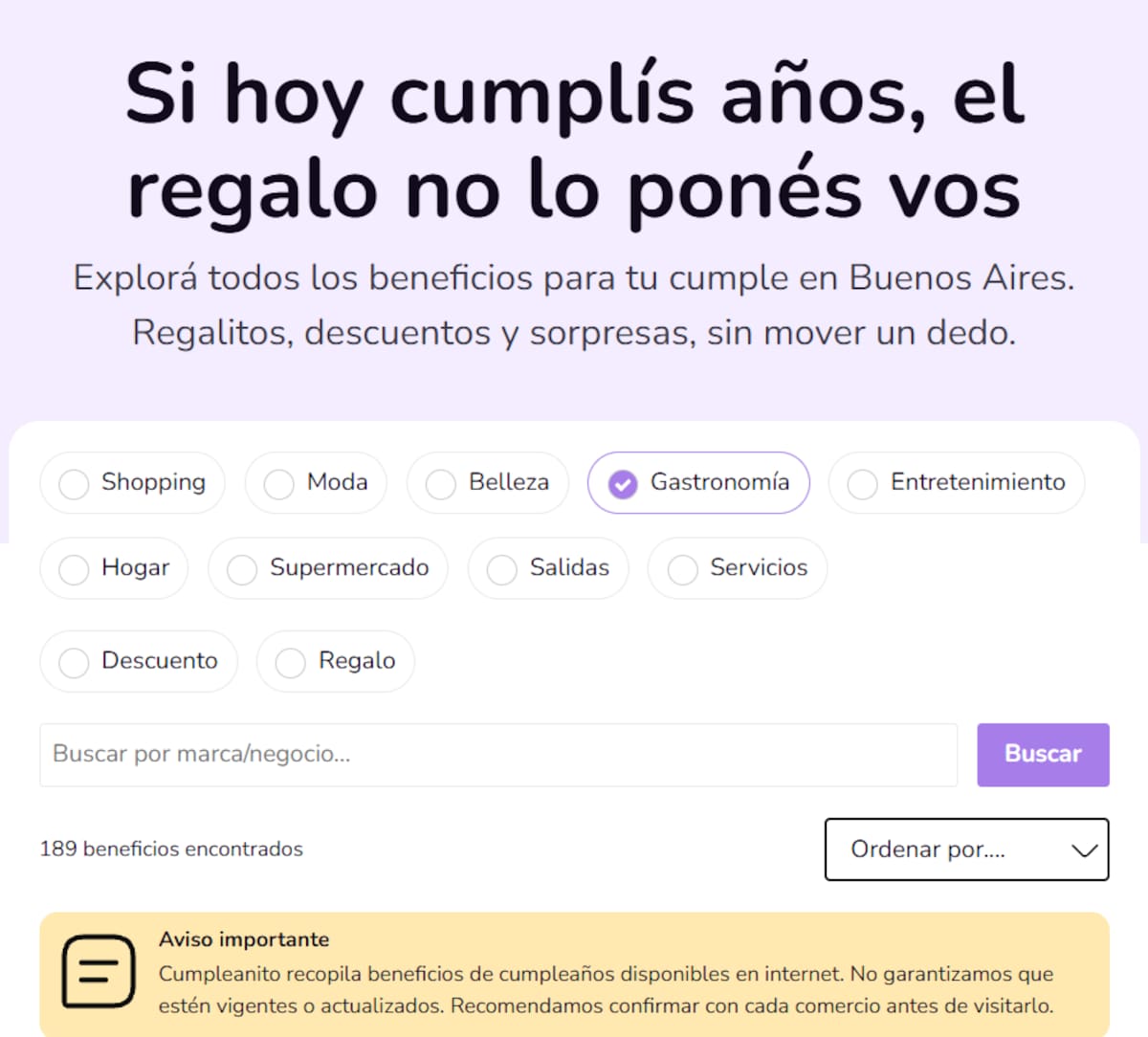 Entre los beneficios más comunes se destacan descuentos en consumos gastronómicos, productos de regalo, bebidas o postres sin cargo y rebajas exclusivas en distintos servicios. Sin embargo, la plataforma aclara lo siguiente: “Cumpleanito recopila beneficios de cumpleaños disponibles en internet. No garantizamos que estén vigentes o actualizados. Recomendamos confirmar con cada comercio antes de visitarlo”.