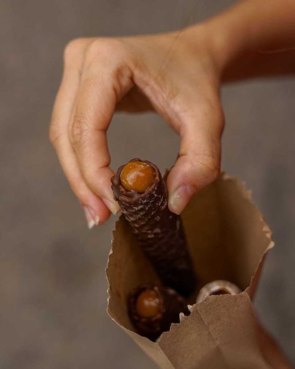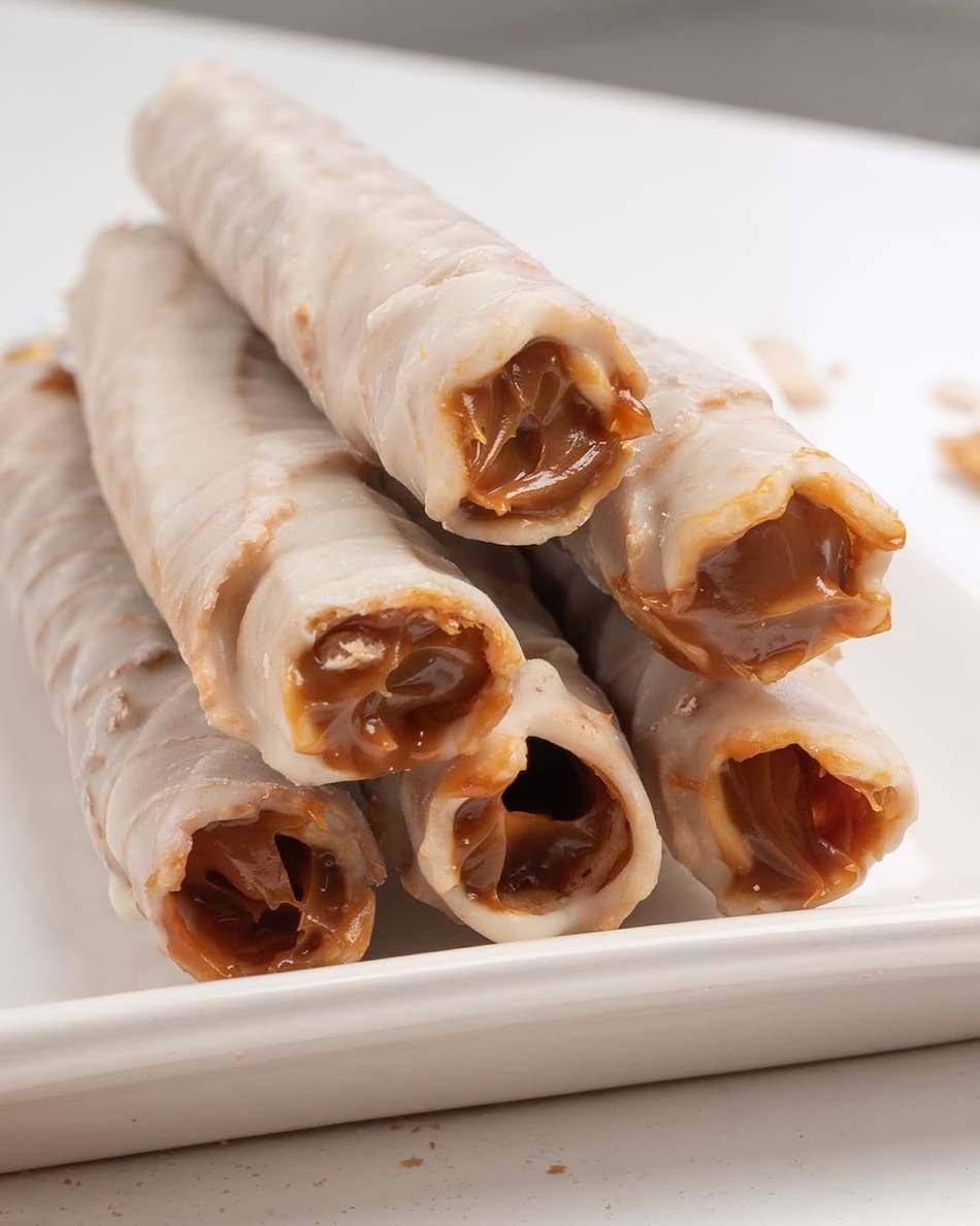 - Rellenar los cubanitos: una vez que los hojaldres estén cocidos y se hayan enfriado, retirar los moldes con cuidado. Usar una manga pastelera para rellenar los cilindros de hojaldre con dulce de leche.